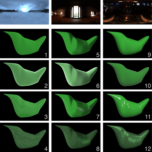 Example of three shapes, rendered with the glittery material (Zhang et al., 2020)