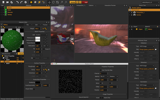 A screenshot of MaxwellRender during the rendering process. Here, a customised texture map is used to represent glittery material. (Zhang et al., 2016)